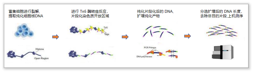 轉(zhuǎn)座酶可以隨機(jī)結(jié)合并切割染色質(zhì)開放區(qū)的DNA,并且可同時在切割位點插入接頭序列。如下圖,只要將攜帶已知DNA序列標(biāo)簽的轉(zhuǎn)座復(fù)合物(即帶紅色和藍(lán)色序列標(biāo)簽的Tn5轉(zhuǎn)座酶)加入到細(xì)胞核中一起孵育,再利用已知序列標(biāo)簽進(jìn)行PCR擴(kuò)增即可形成文庫,經(jīng)過測序就可以獲得染色質(zhì)開放區(qū)的信息。