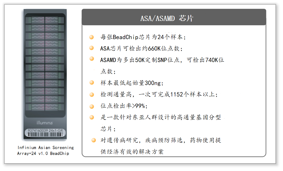 Infinium Asian Screening Array-24 v1.0 (ASA) BeadChip 是一款先進的基因分型芯片,可為群體規(guī)模遺傳研究、變異篩選和精準醫(yī)學研究提供高價值、可擴展且經濟高效的解決方案。