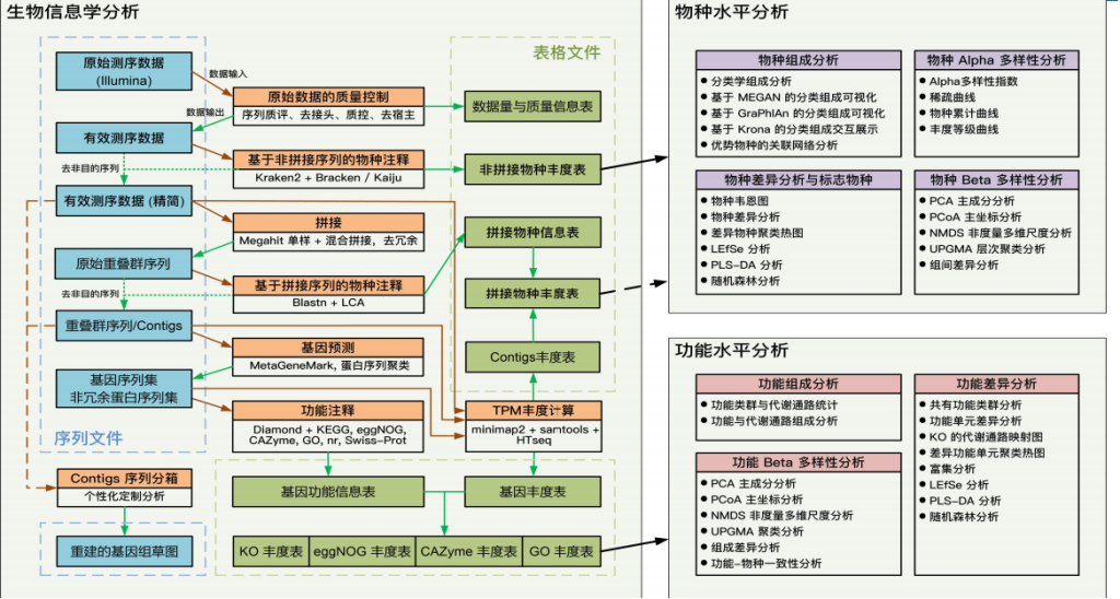宏基因組學(xué)(Metagenomics)研究通過全基因組鳥槍法(Whole Genome Shotgun,WGS)測序策略,將提取獲得的微生物組總DNA隨機打斷為短片段,并構(gòu)建合適長度的插入片段文庫,對這些文庫進(jìn)行雙端(Paired-end,PE)高通量測序,從而能精細(xì)地展示整個菌群的功能代謝譜和物種精細(xì)組成譜,進(jìn)而在組成和功能水平分別挖掘關(guān)鍵生物標(biāo)記物,從原理上闡明微生物群落在生態(tài)系統(tǒng)中發(fā)揮作用的根本機制。