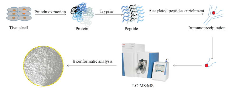 蛋白質乙?;?Acetylation)是蛋白在乙?;D移酶(或非酶)的催化下,將乙?;鶊F轉移并添加在蛋白賴氨酸殘基或蛋白N端上的過程,在調控蛋白質功能、染色質結構和基因表達中起重要作用。乙酰化修飾主要分為兩類:蛋白N端的乙酰化修飾和蛋白賴氨酸上的乙?;揎?。N端乙?;揎棿蟛糠职l(fā)生在真核生物的蛋白上,由N乙酰轉移酶(NATs)催化;賴氨酸上的乙?;揎検且粋€可逆的過程,主要由賴氨酸乙?;福↘ATs)和賴氨酸去乙?;福↘DACs)催化。